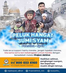 Alhamdulillah, @projectakhirat_nsts memiliki Program Kemanusiaan “Hangatkan Palestina dan Syam” di musim dingin ini. Uluran tangan kita bisa sangat membantu untuk menghangatkan dan menyemangati mereka yang sedang berjuang menghadapi dinginnya musim.